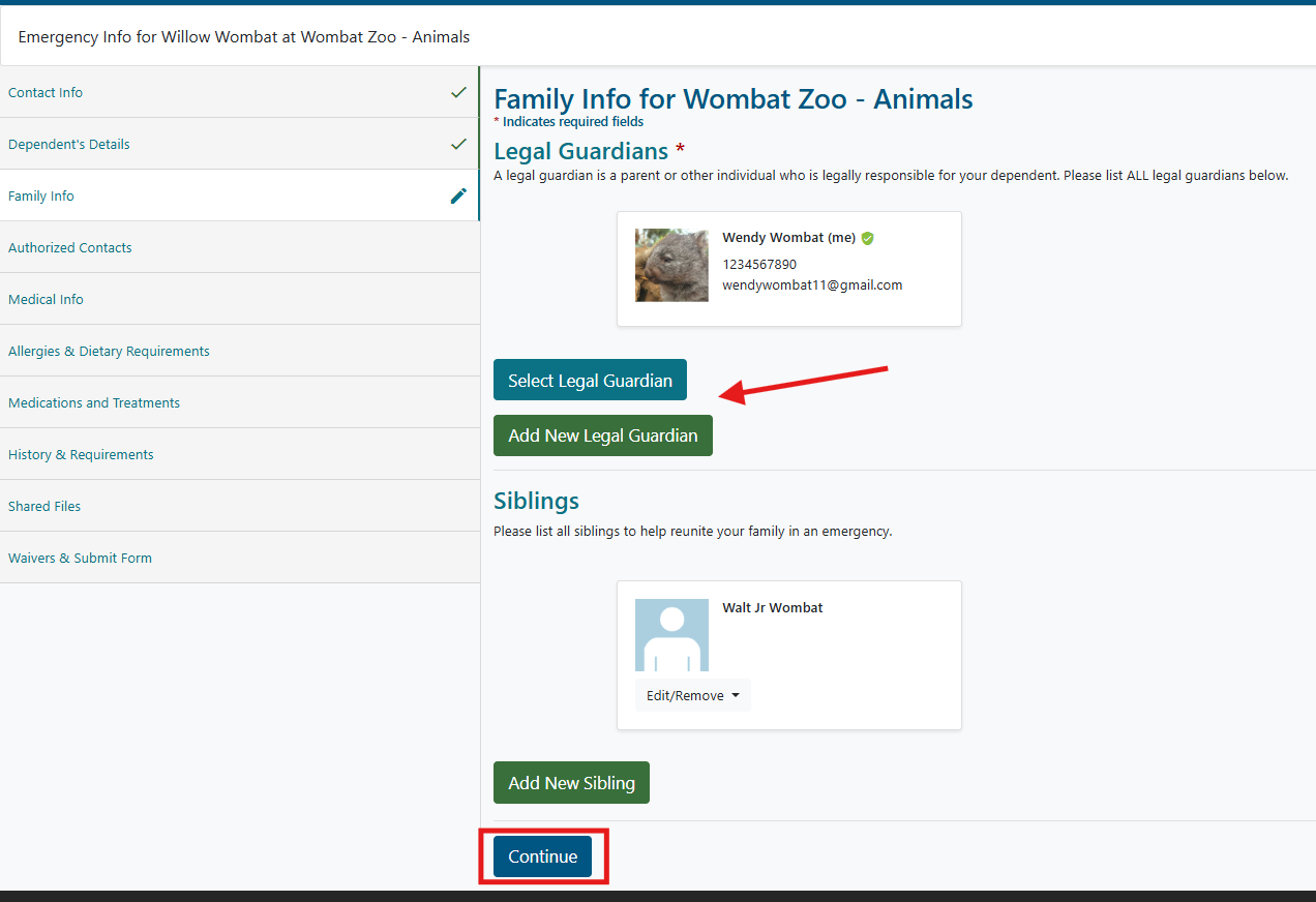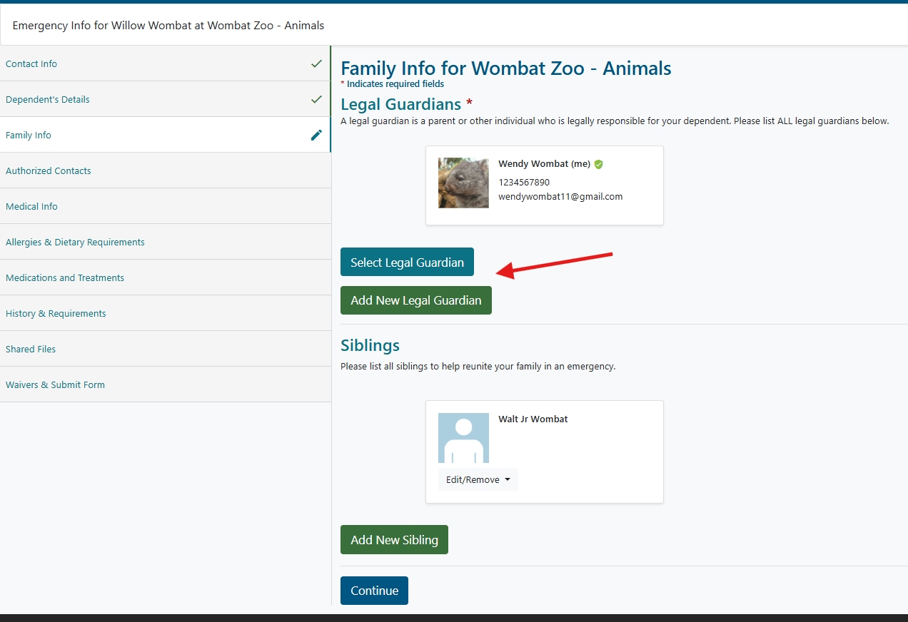 4. Click on Add New Legal Guardian to add a new legal guardian OR if this person already exists for another dependent, please click Select Legal Guardian. Be sure you wish to add an email address and send an invitation for the other legal guardian - please refer to the red font at the top of this help article.