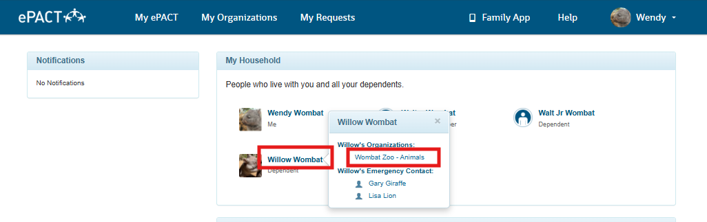 2. Click on your dependant's name you wish to add a legal guardian to, and then the organization you wish to edit the information fo.