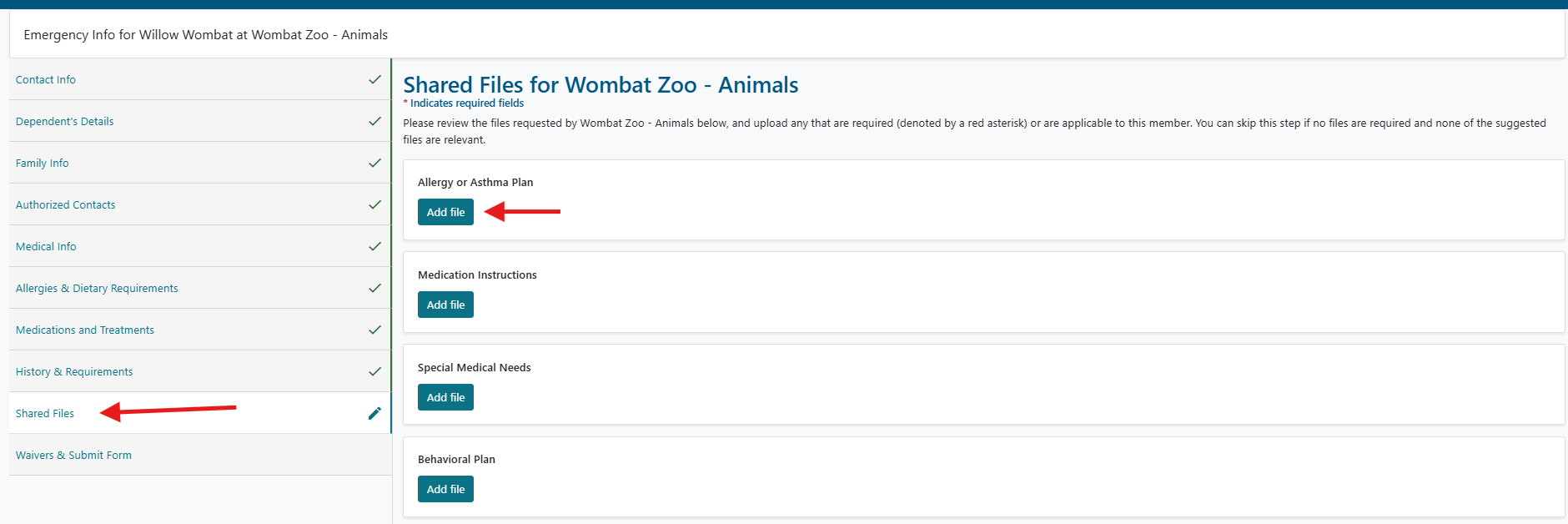When entering emergency information for yourself or a dependent, you will have the option to upload additional files or documents on the Shared Files step. You can add an allergy plan, doctor's report, immunization records, etc.