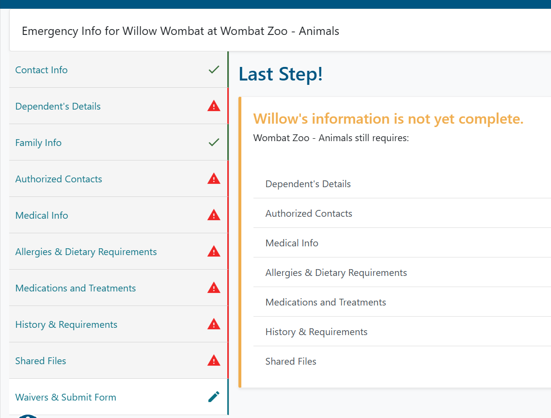 Once you reach the Complete Info step, the information you are missing will be displayed, with a link to where it can be found and a red triangle also indicating an incomplete step. Simply click on the link or the step and you will be taken to the corresponding page to complete the missing information which will be indicated with a red asterisk *.