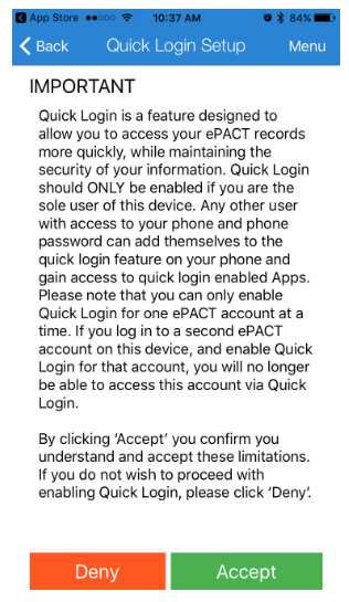 3. Please accept the Terms of Use by clicking the 'Accept' button and then confirm your quick log in method, either touch/fingerprint ID, PIN or Pattern.