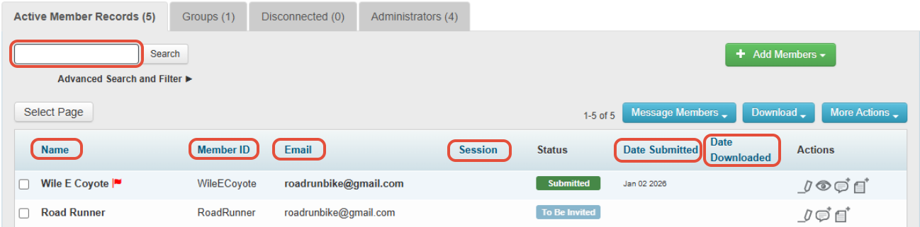 Admins can search for members in the Search bar by the following: