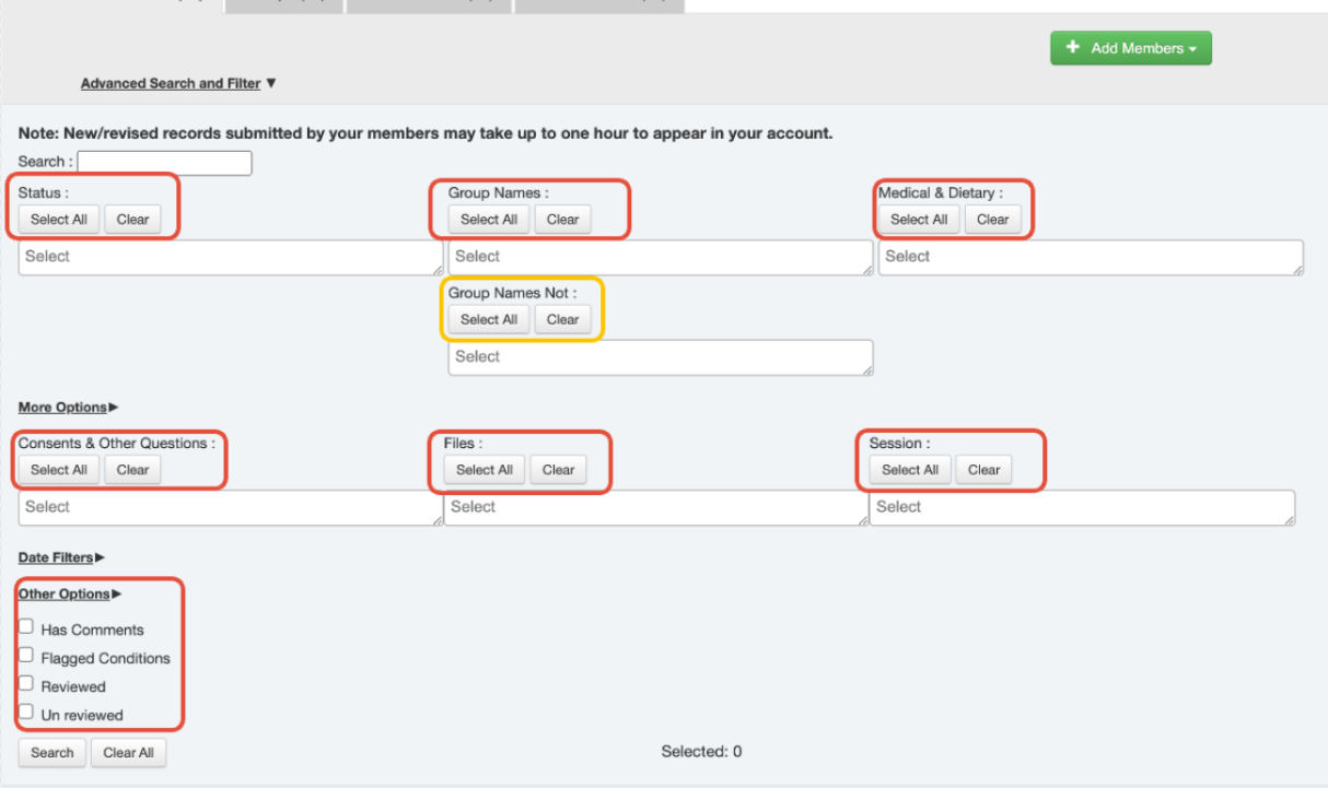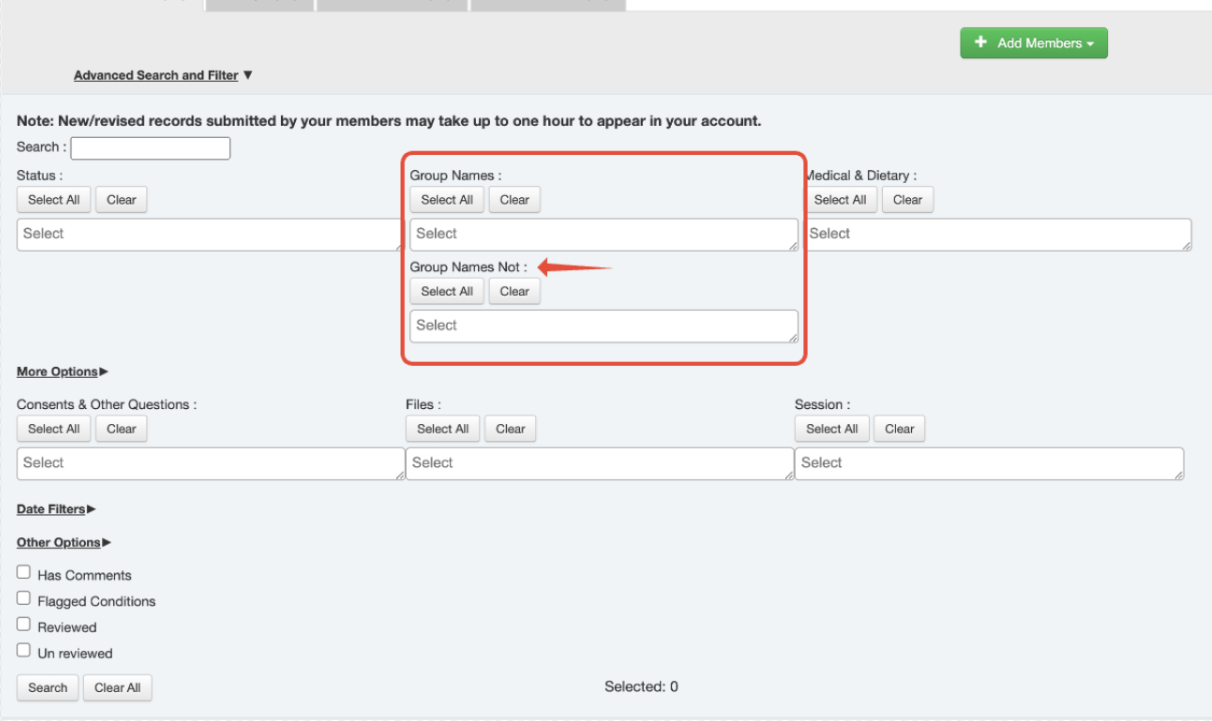 The Group Names Not filter (highlighted above in yellow) allows quick exclusion of members belonging to the group(s) selected in this filter. Please note that this filter takes priority over the other filters selected.