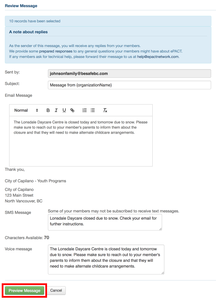 - Include your message in the email text box. If SMS and/or voice messages are enabled, you can choose to send a text or voice message as well