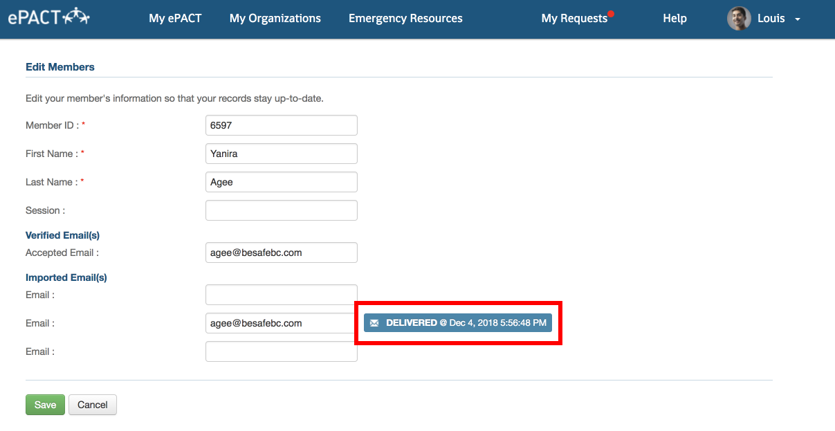 Organization administrators can message any member or members' emergency/pickup/other contacts within the organization. They can also see when the last email was sent to any member by clicking on the Edit icon on the record. The last date of the delivered message will be visible next to their email address.