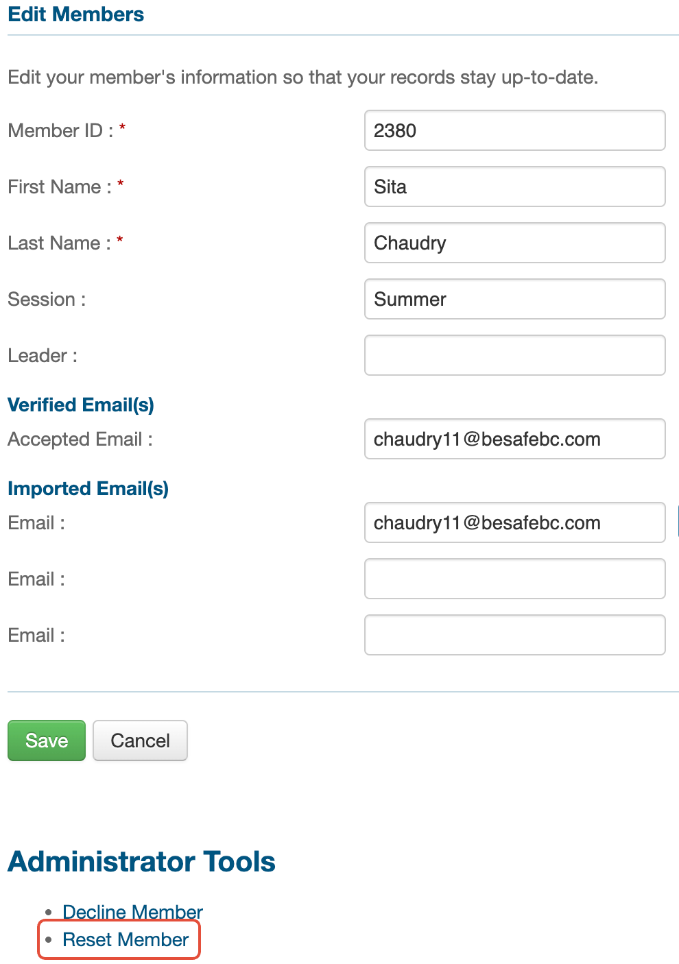 If a member is in "Outstanding", but now wants to use a different email address to complete the record - click on Reset Member and this will revert the member back to "To Be Invited".
