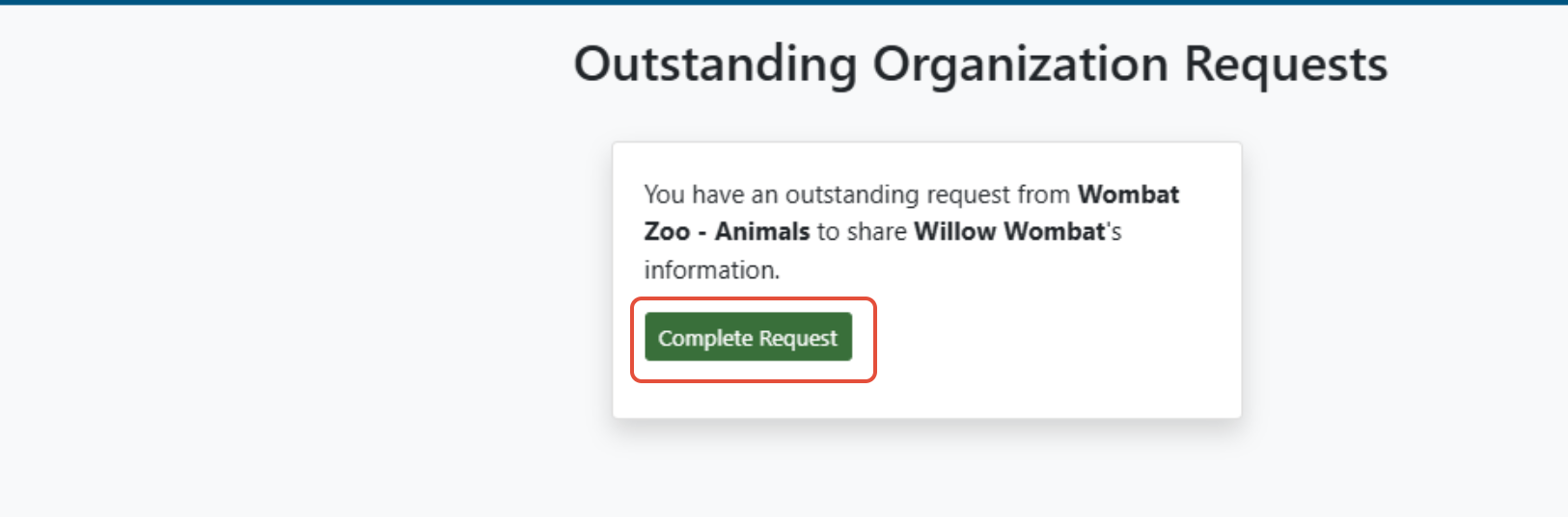 2. You'll be brought to the My Requests page. Click the green Complete Request button for the member of your family and corresponding organization that you are sharing information for.