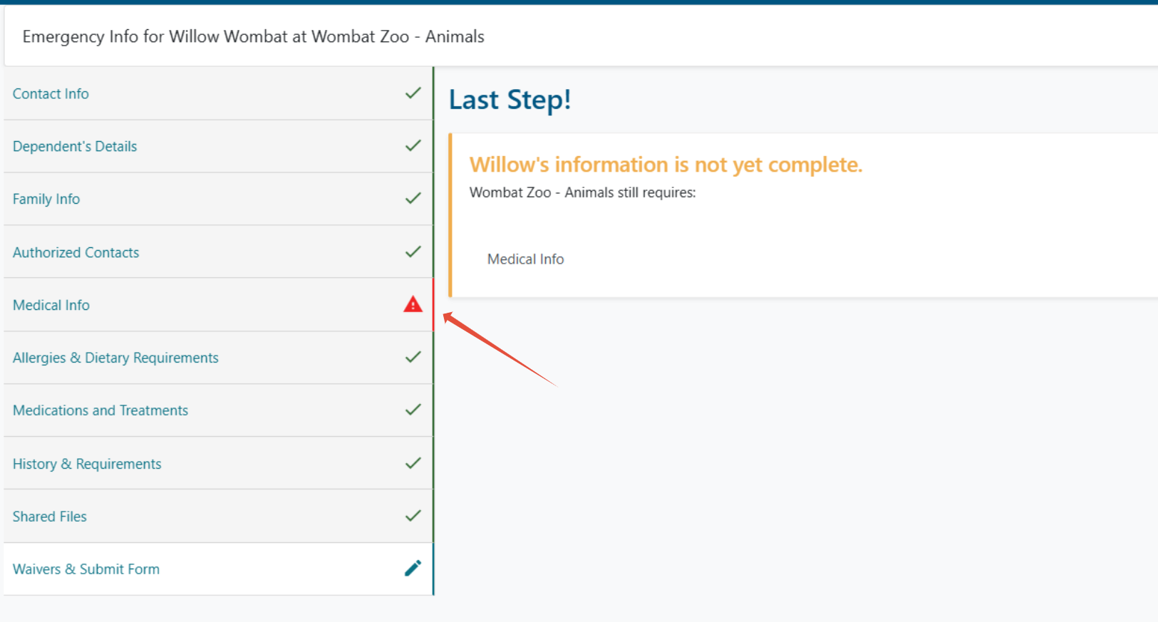 3. All incomplete steps will be listed and will also have a red triangle next to them on the left hand side.