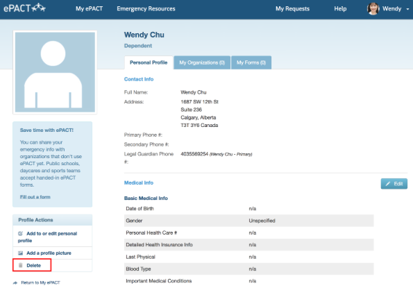 On this page, click Delete under Profile Actions on the left-hand side. (If no Delete button is available, please contact ePACT for help).